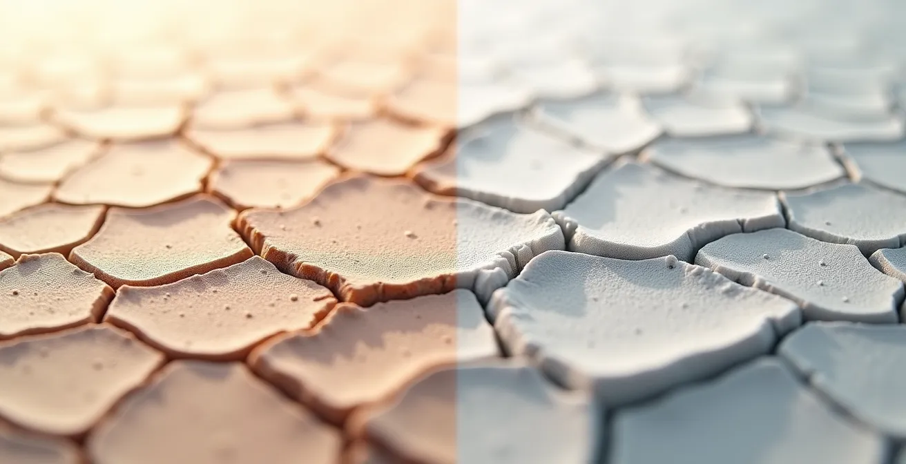 Die gängigen Ratschläge – mehr Wasser trinken, eine reichhaltigere Creme verwenden – kratzen nur an der Oberfläche. Sie ignorieren die entscheidende Frage: Fehlt Ihrer Haut Fett (Lipide) oder Wasser (Feuchtigkeit)? Dies ist der Unterschied zwischen genetisch bedingter trockener Haut und einem temporären Zustand von dehydrierter Haut. Eine reichhaltige Öl-Creme auf einer Haut, die eigentlich durstig nach Wasser ist, kann die Poren verstopfen und das Problem sogar verschlimmern. Umgekehrt wird eine lipidarme Haut von einem leichten Hyaluron-Gel allein nicht ausreichend geschützt.